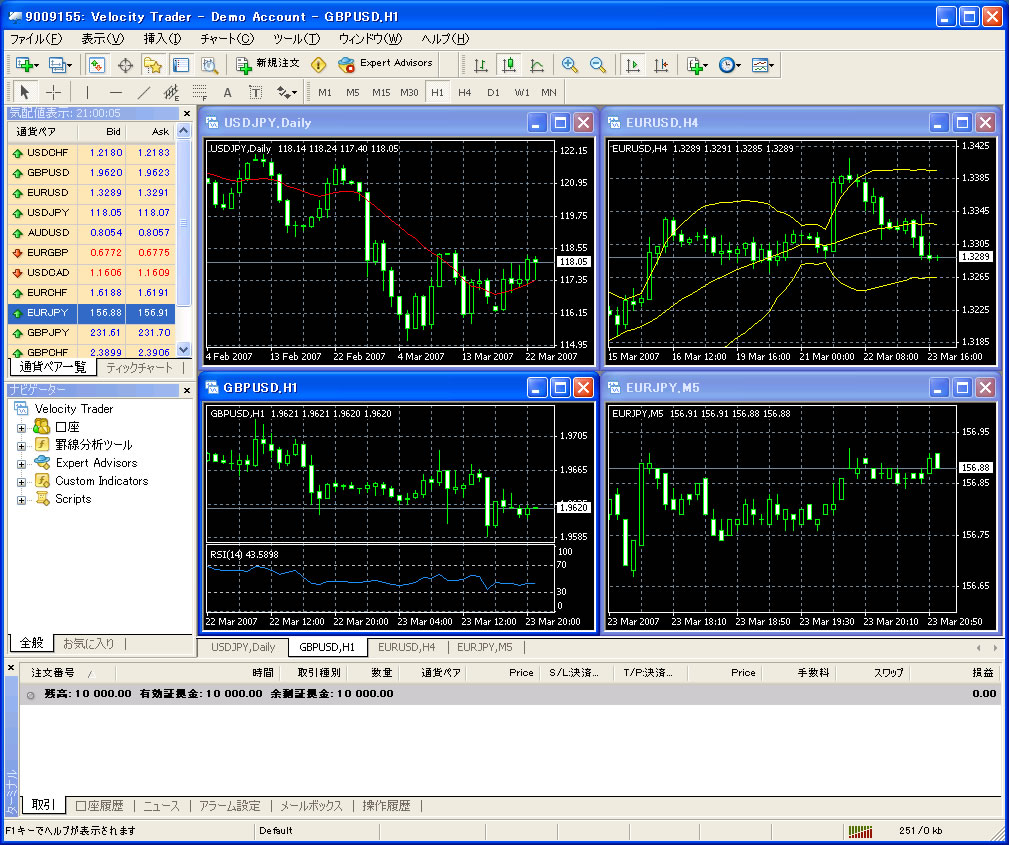 ■高機能トレーディングプラットフォームVelocity Trader(ベロシティートレーダー)は、Velocity4xが提供する高機能トレーディングソフトです。 売買注文の執行はもちろん、多数のトレード指標の表示、売買ストラテジーの検証、売買ストラテジーの実行(自動売買)が、このソフト1つで全て行えます。