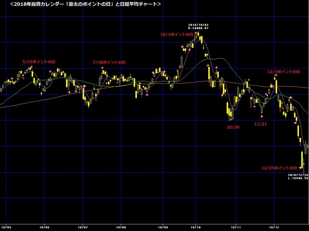 最高値 10月2日 24448円 最安値 12月26日18948円 10月1日ポイントの日、12月25日ポイントの日 | 【ポイントの日】 4月24日、6月3日、9月20日 大回り6ヶ月の中で市場の変化日を捉え、 日経平均23008円をつけた10月29日もポイントの日でした。年末までの相場もポイントの日が分岐点となるでしょう。 |